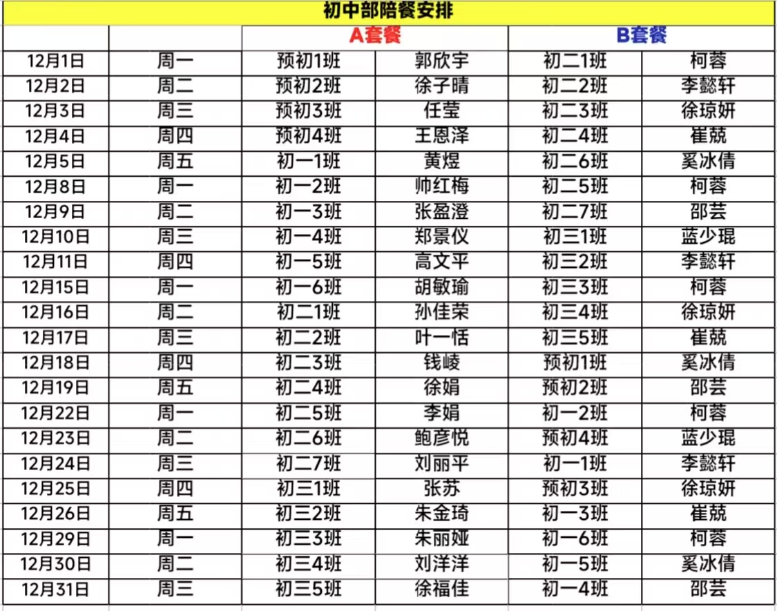 上海市零陵中学12月陪餐安排