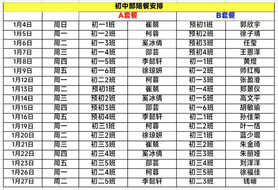 上海市零陵中学2026年1月陪餐安排(初中部)